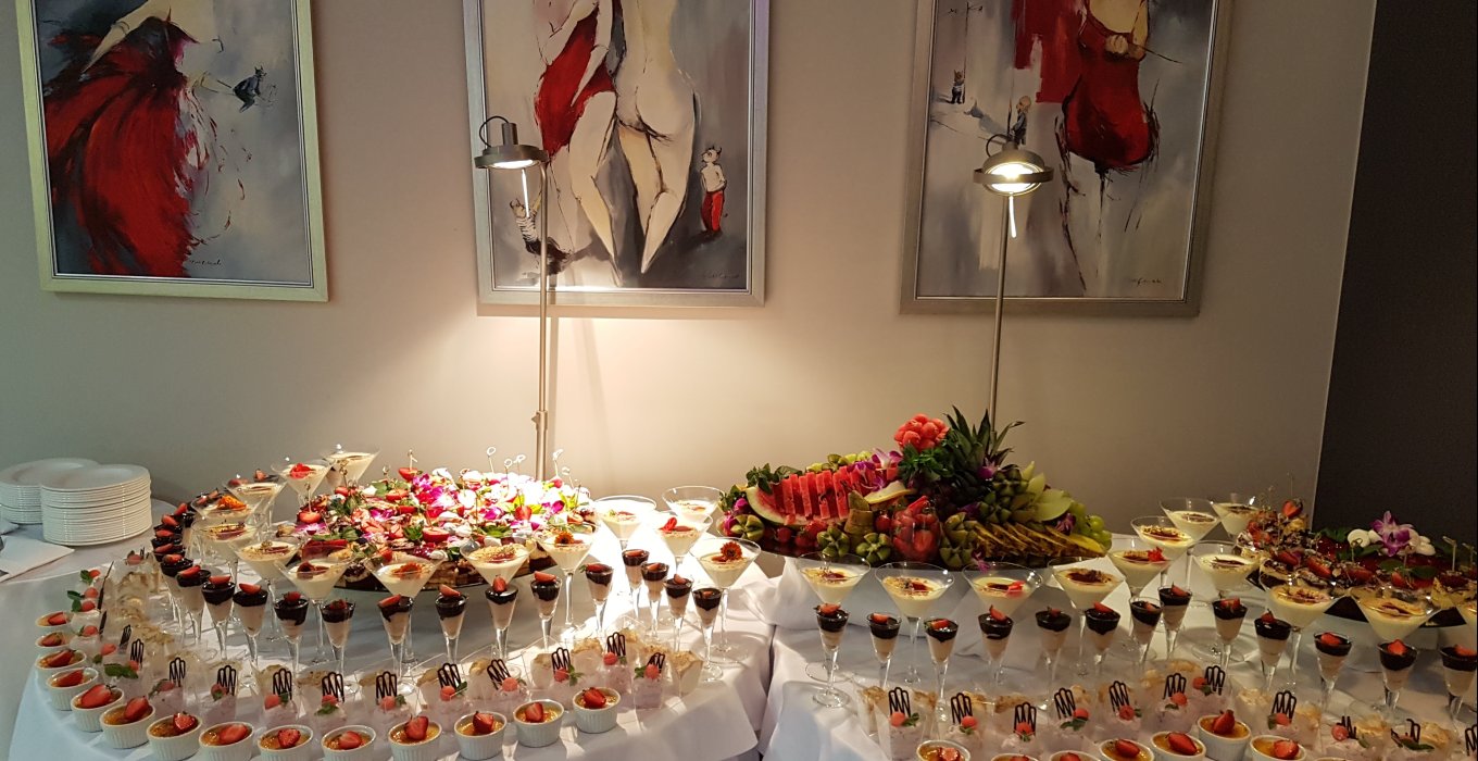 Podczas przygotowywania posiłków, kucharze wykorzystują produkty o najwyższej jakości i świeżości. Oferowane stoły tematyczne takie jak: "stół staropolski", "ryby i owoce morza", "sery świata", sushi" spełnią oczekiwania nawet najwybredniejszych gości. Na życzenie organizowany jest również pokaz kuchni molekularnej wraz z degustacją, a dla spragnionych eleganckich drinków "open bar". Na terenie obiektu znajduje się również Chata Grillowa, gdzie można zorganizować swobodne przyjęcie lub poprawiny.