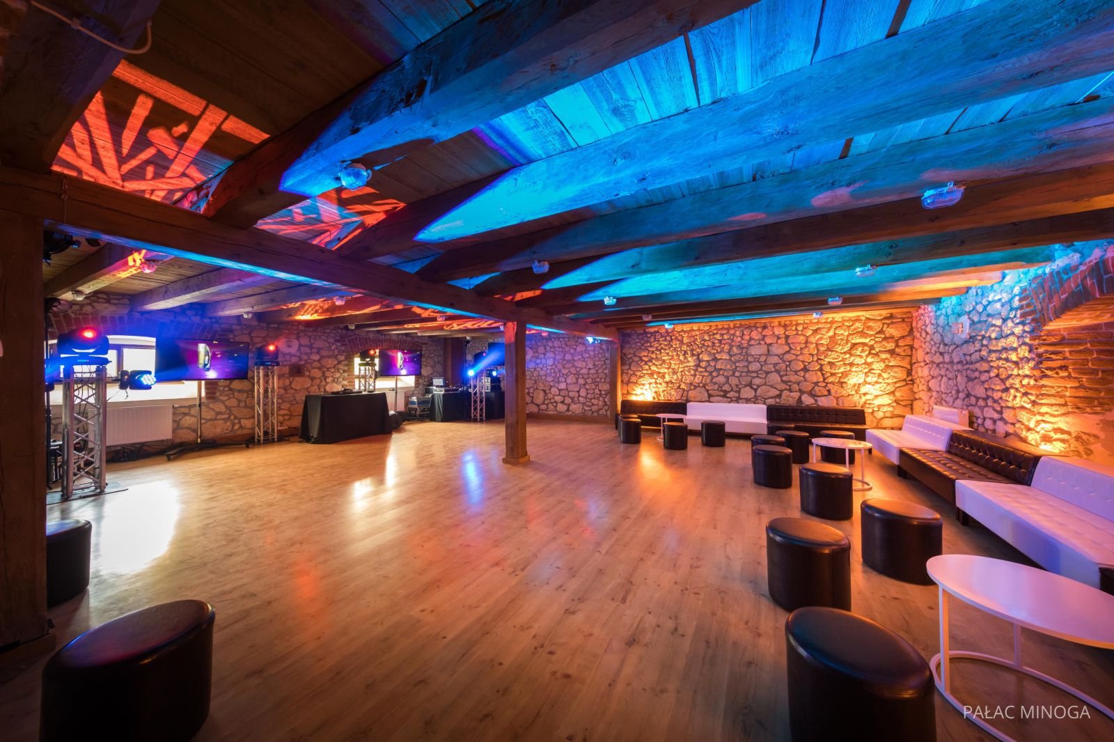 Kompleks udostępnia cztery sale mieszczące się na parterze oraz dwie sale w kamiennych piwnicach. Każde wnętrze posiada swój unikatowy charakter, można zdecydować się na sale o eleganckim wystroju lub bardziej rustykalnym klimacie. Pałac Minoga posiada stylowy bar, duże okna z widokiem na ogród, doskonałe nagłośnienie oraz wielokolorowe oświetlenie.