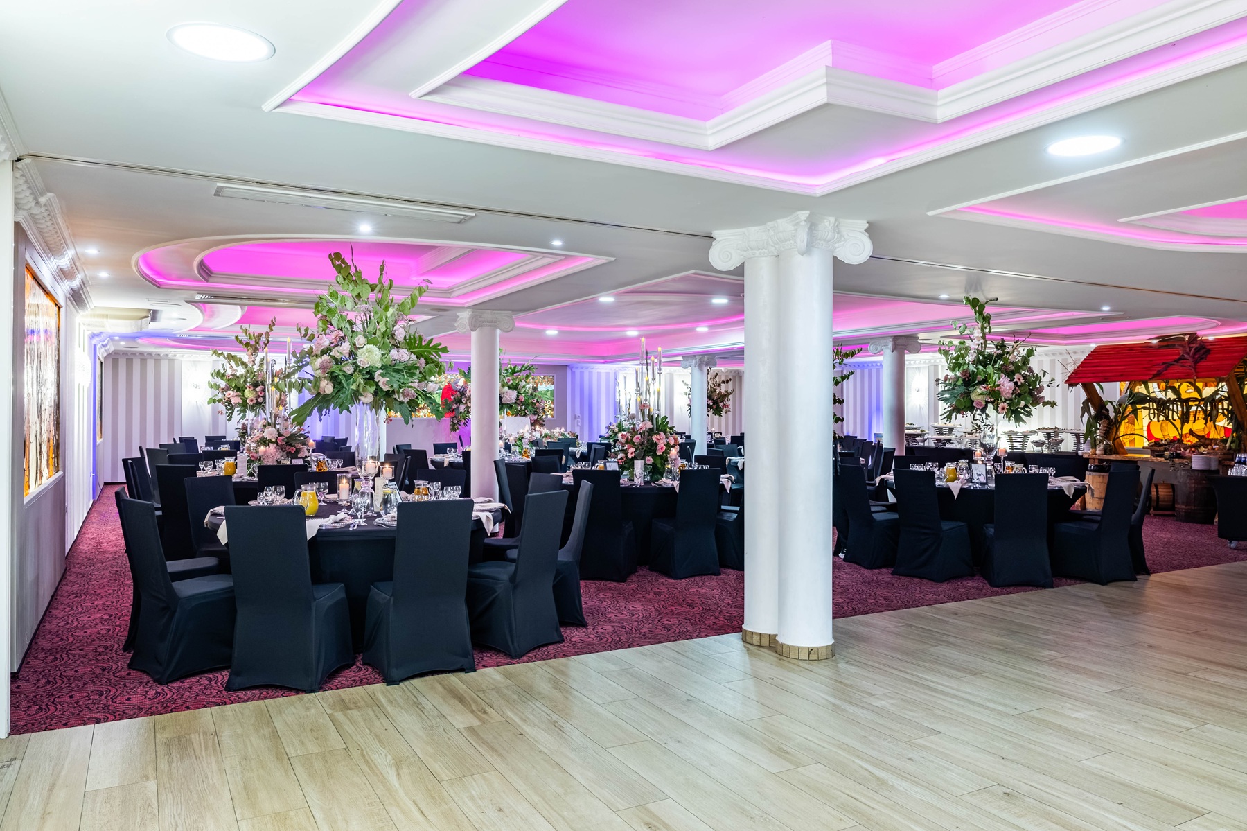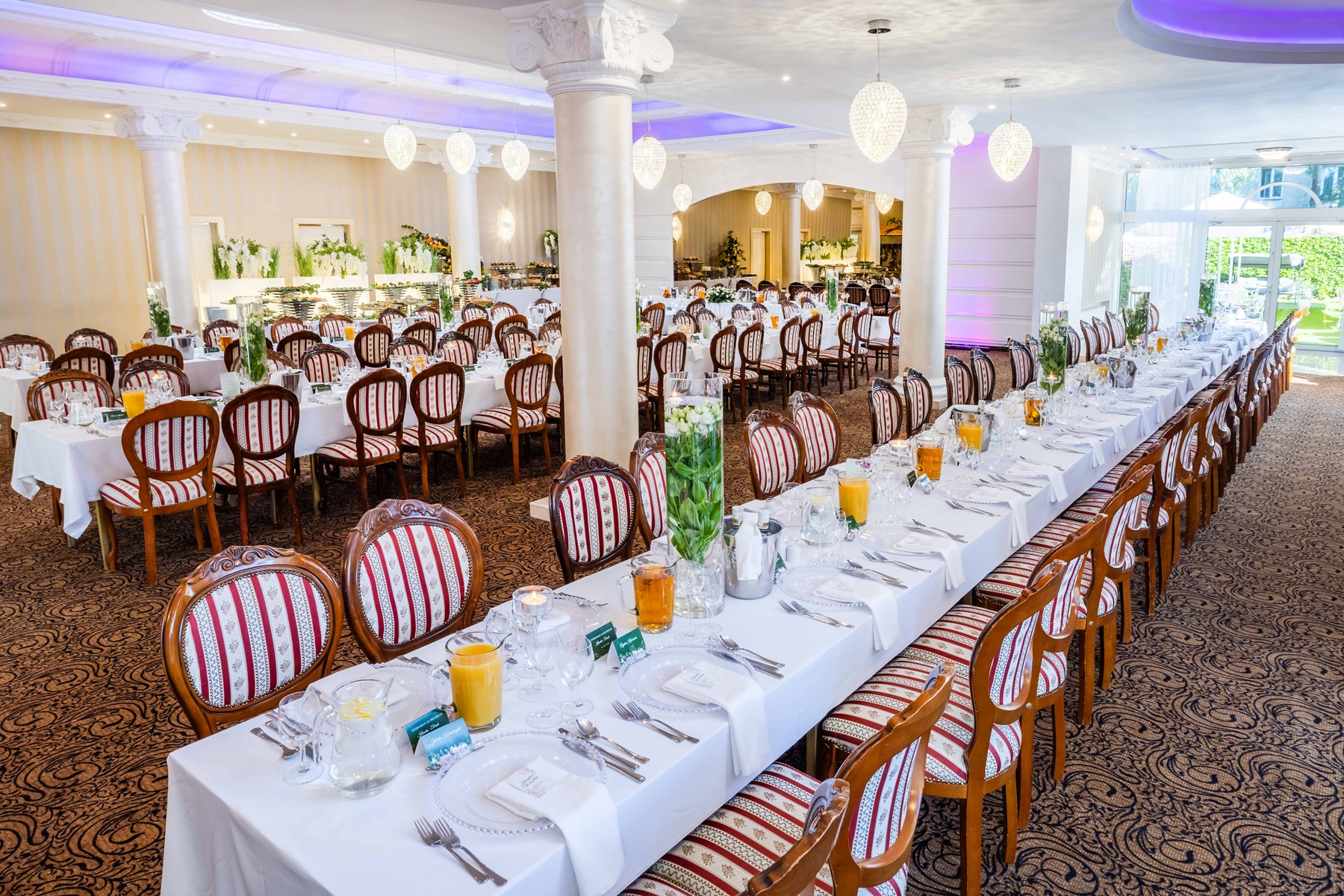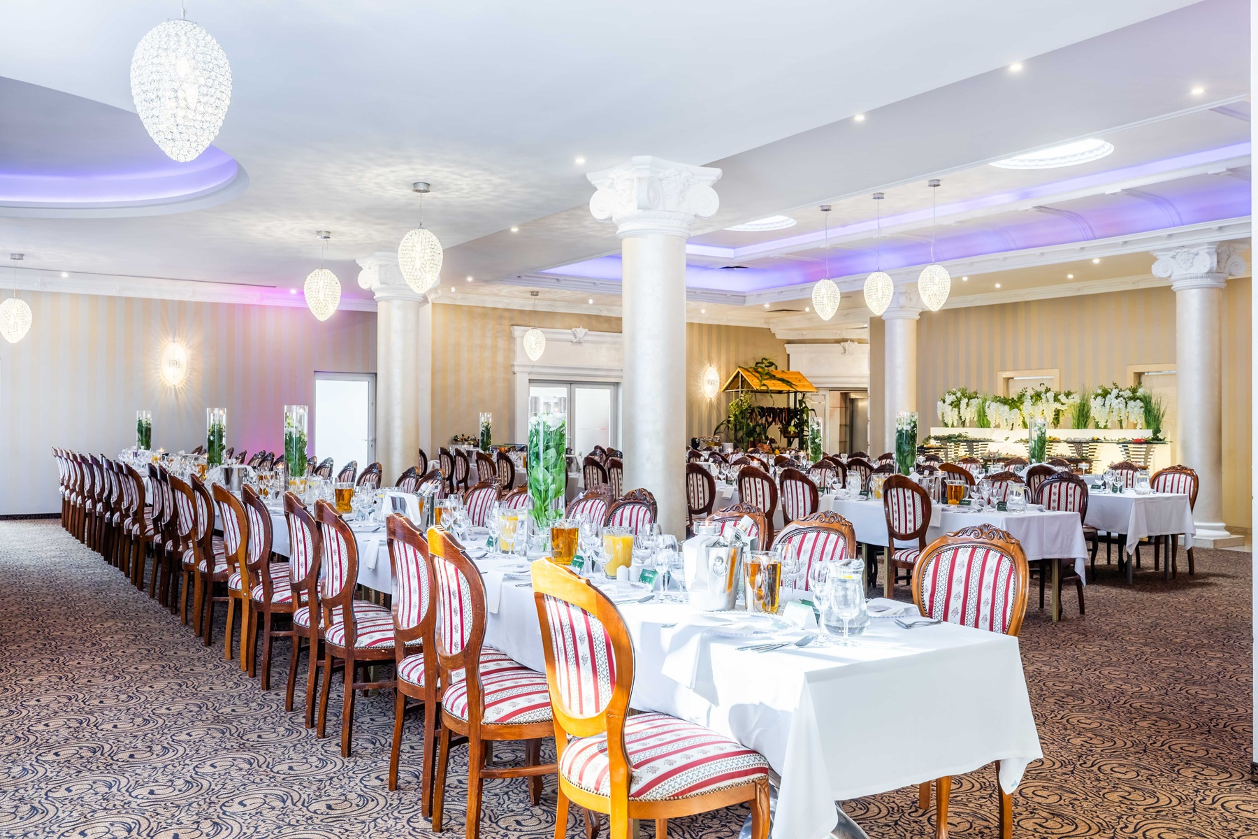 * Restauracja Kryształowa - klimatyczna sala z dużym parkietem oraz tarasem - wymarzona dla okazałych uroczystości weselnych. Istnieje możliwość połączenia jej z Salą Kolumnową z możliwością przystosowania sal dla 320 gości weselnych.