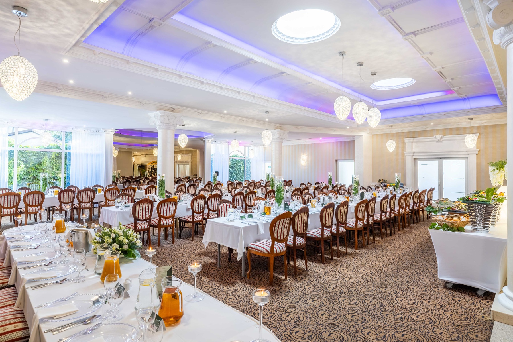 * Sala Witrażowa - największa z sal hotelu, zdobiona pięknymi witrażami oraz dająca wiele możliwości aranżacyjnych - często z wykorzystaniem sąsiedniej Sali Lustrzanej pozwala na organizację dużych przyjęć weselnych przeznaczonych dla 350 gości weselnych.