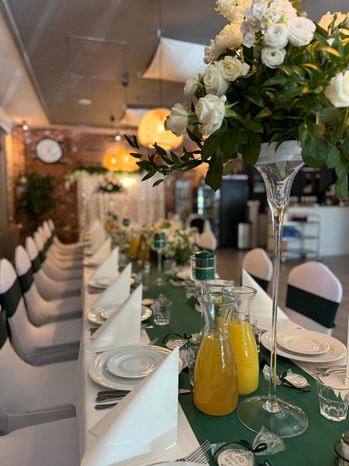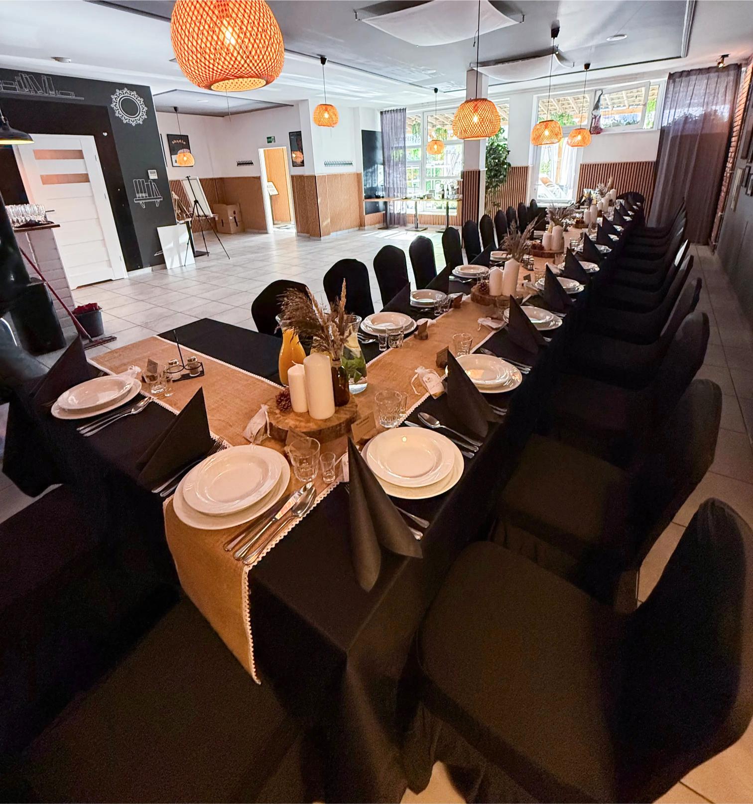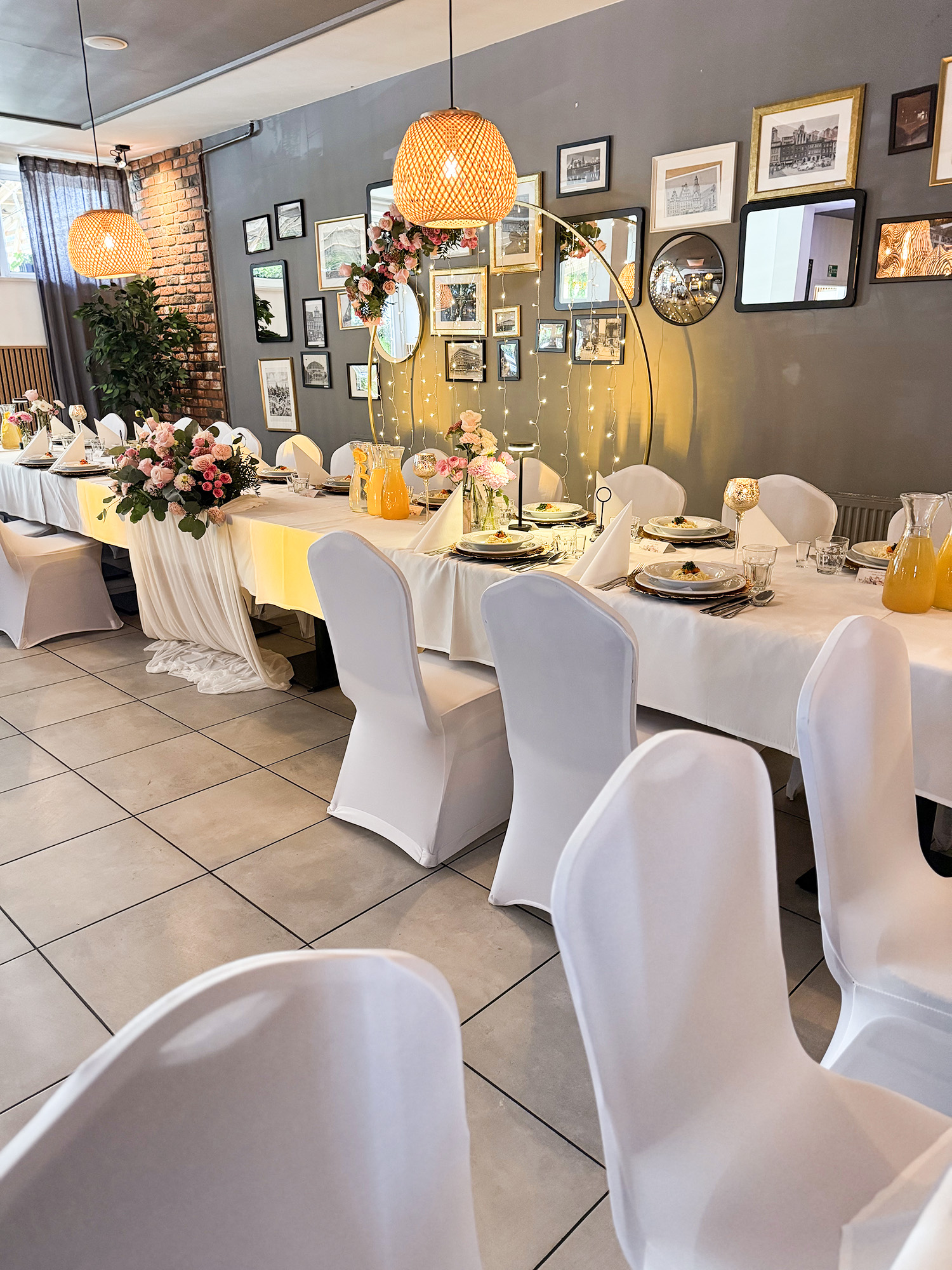 Ciepłe oświetlenie, naturalne materiały oraz artystyczne detale tworzą atmosferę, która sprzyja zarówno romantycznym momentom, jak i radosnej celebracji. Wnętrze zostało zaprojektowane tak, aby z łatwością dopasować je do osobistych preferencji i charakteru przyjęcia.