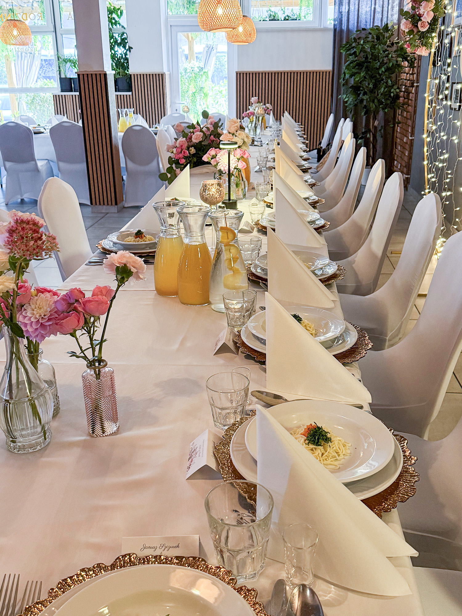 Duży Pokój proponuje kompleksową i elastyczną ofertę weselną. Sala weselna wyróżnia się jasnym, uniwersalnym wystrojem, który pozwala na realizację dekoracji w praktycznie każdym stylu – od klasycznej elegancji, przez boho, po minimalistyczne, nowoczesne aranżacje. Duże przeszklenia zapewniają naturalne oświetlenie, a przemyślany układ wnętrza sprzyja komfortowej zabawie i swobodnemu przepływowi gości.