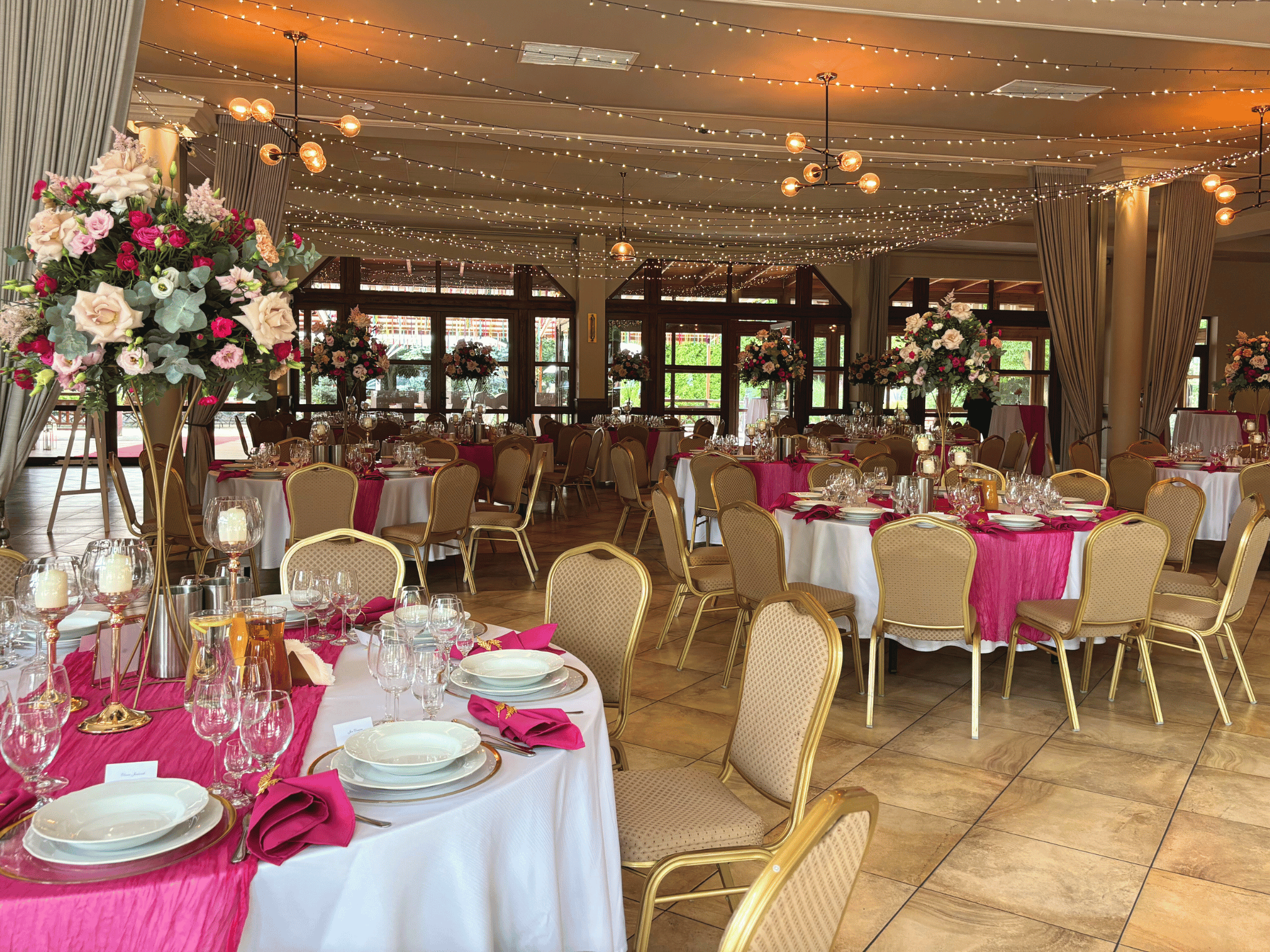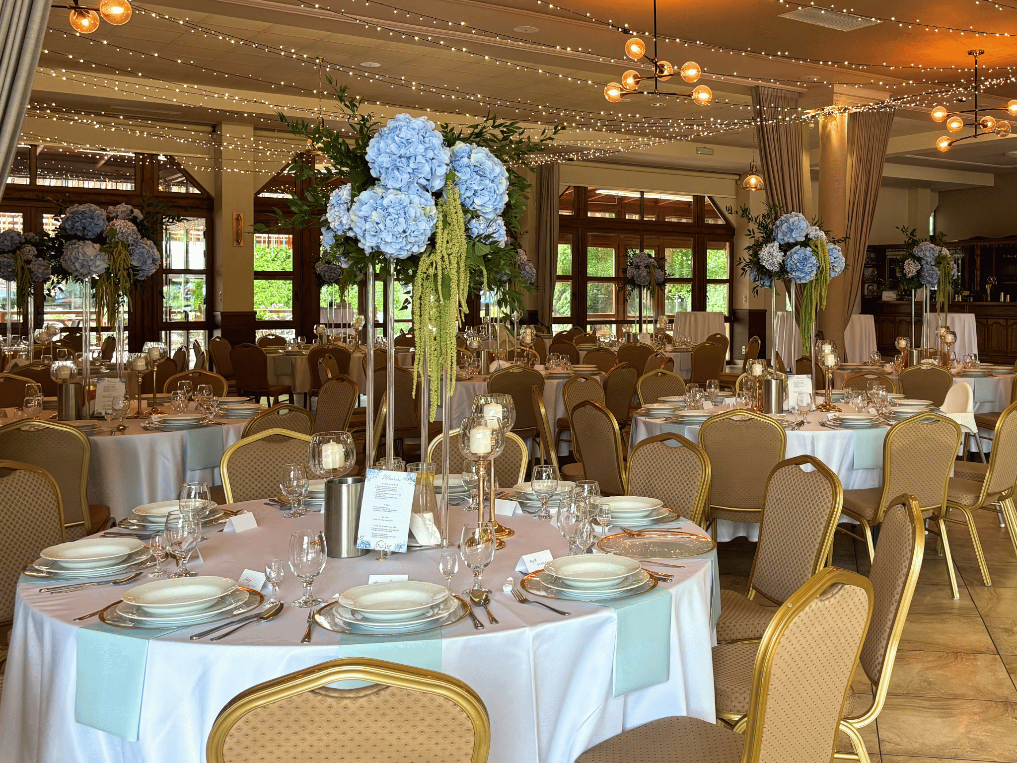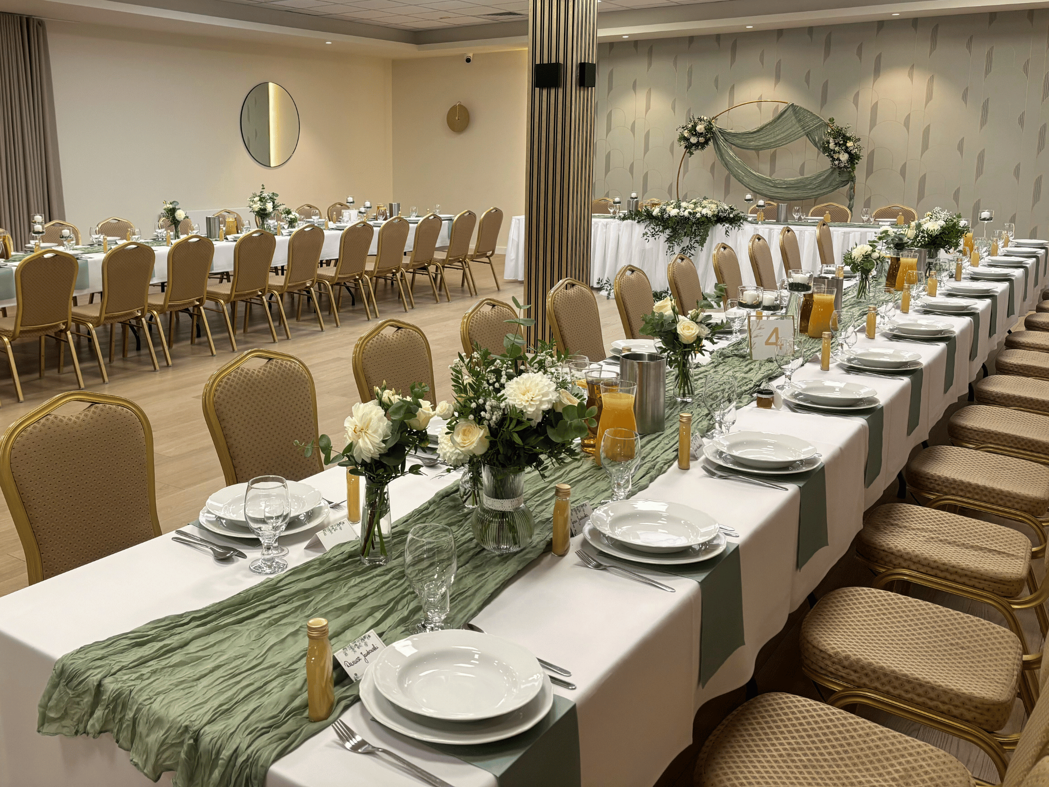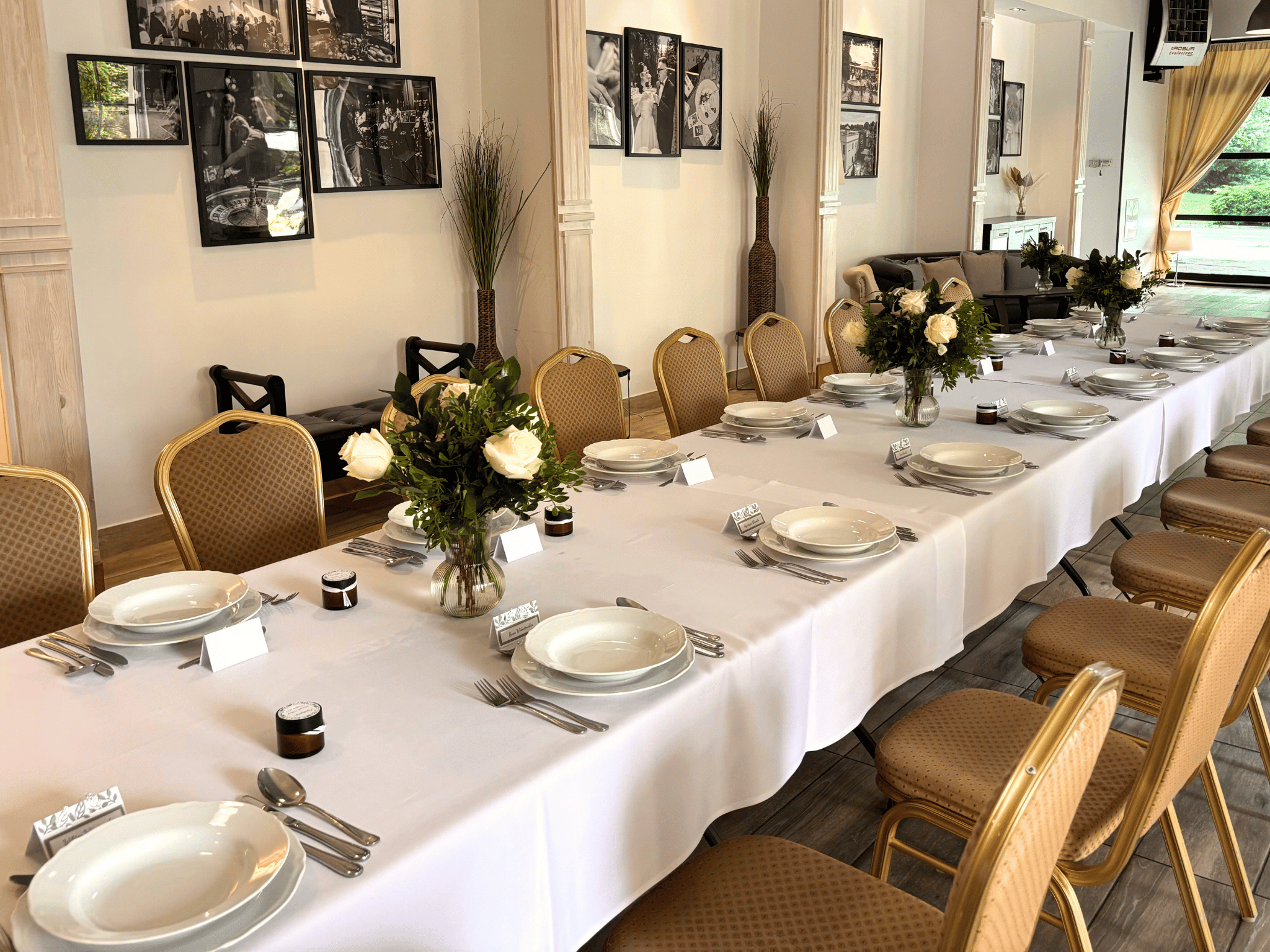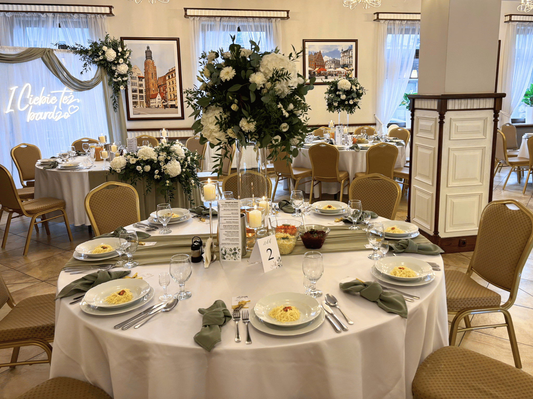 - Pełne nakrycie stołów (zastawa, serwety, świece),